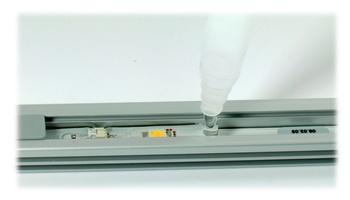 Aquí tenemos un ejemplo de encpasulado de precisión con una silicona transparante con un equipo automático de ratio variable.
