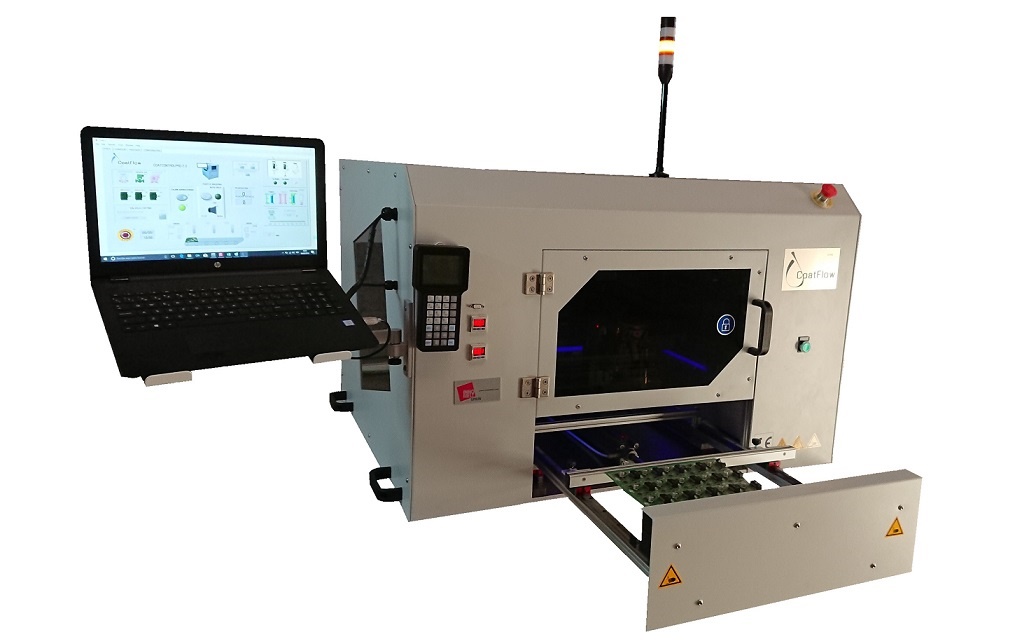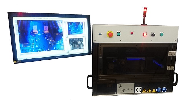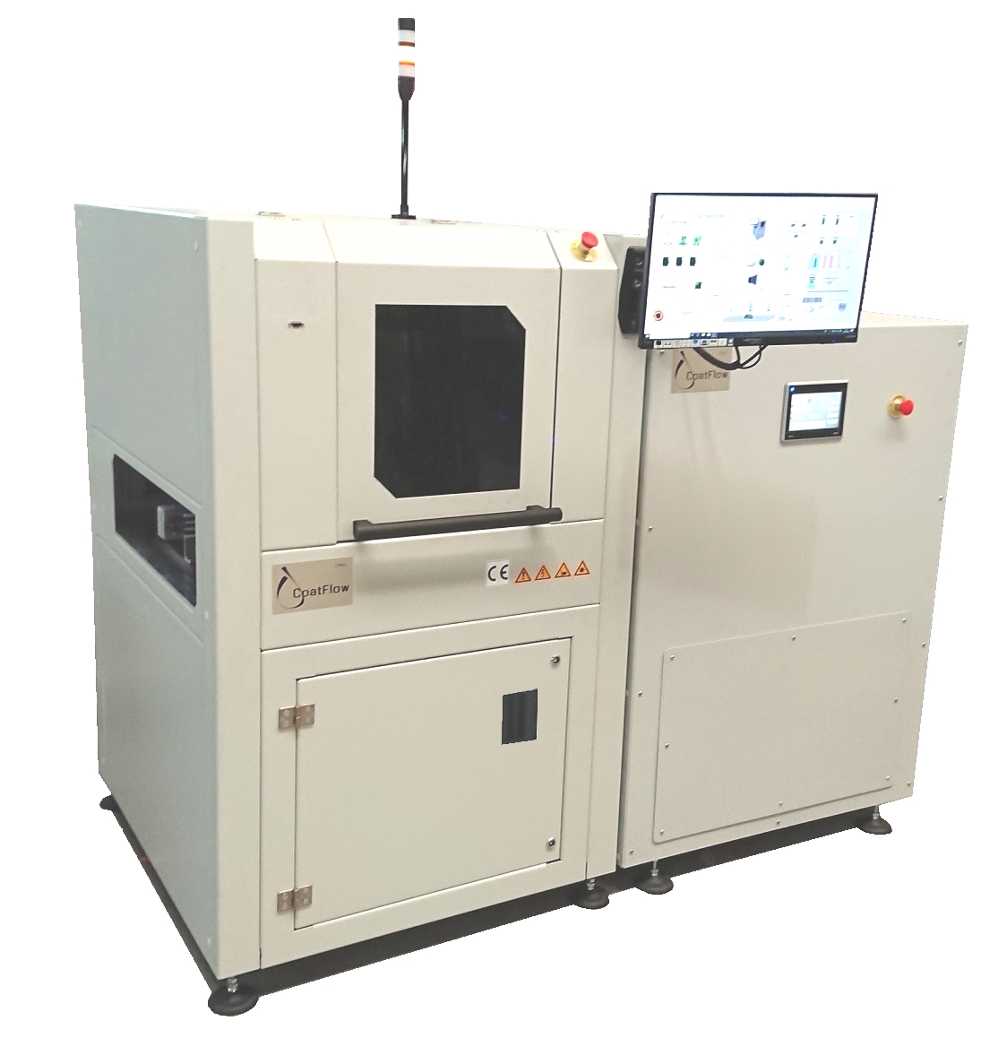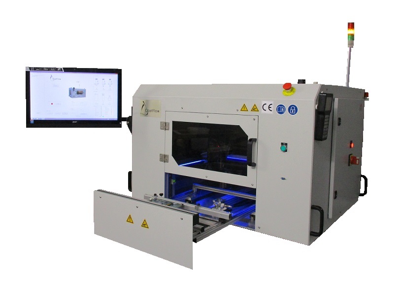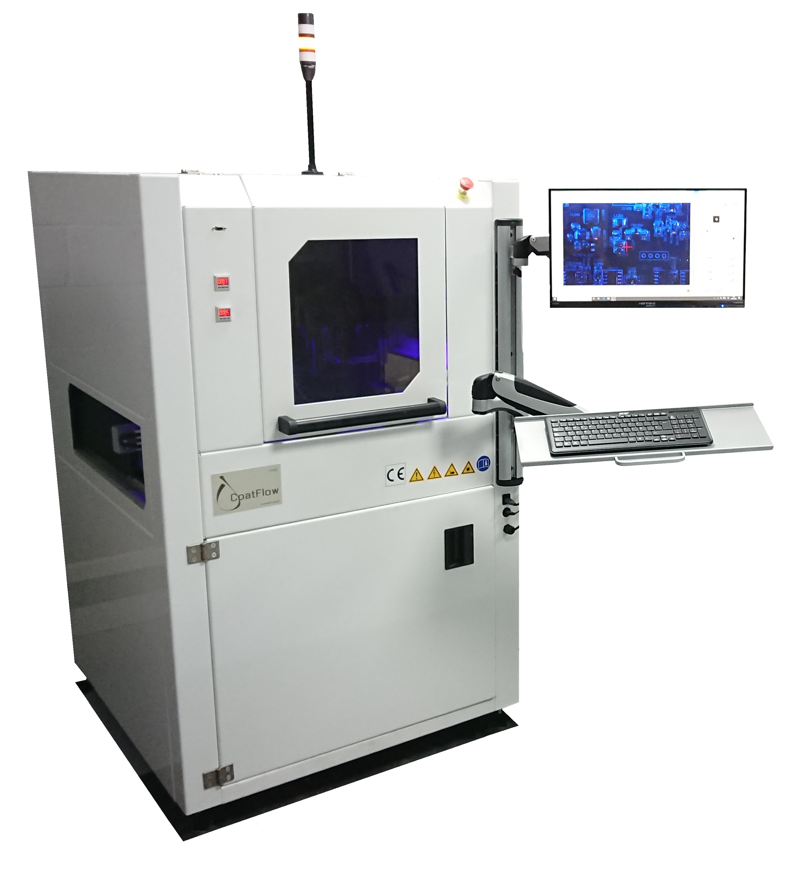 Modelo visionado con Joystick de programación, cajón automático de carga y descarga, luz blanca LED para programación y luz negra para inspección. Software control de todos los parámetros de dispensación en tiempo real COATCONTROLPRO en pantalla táctil incluido.